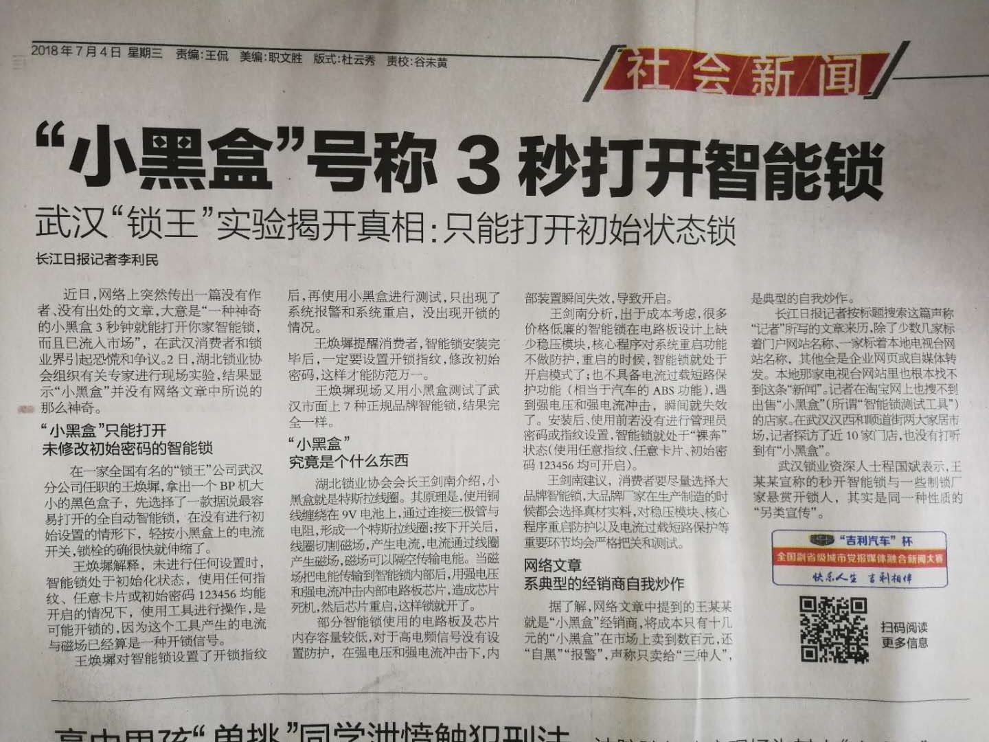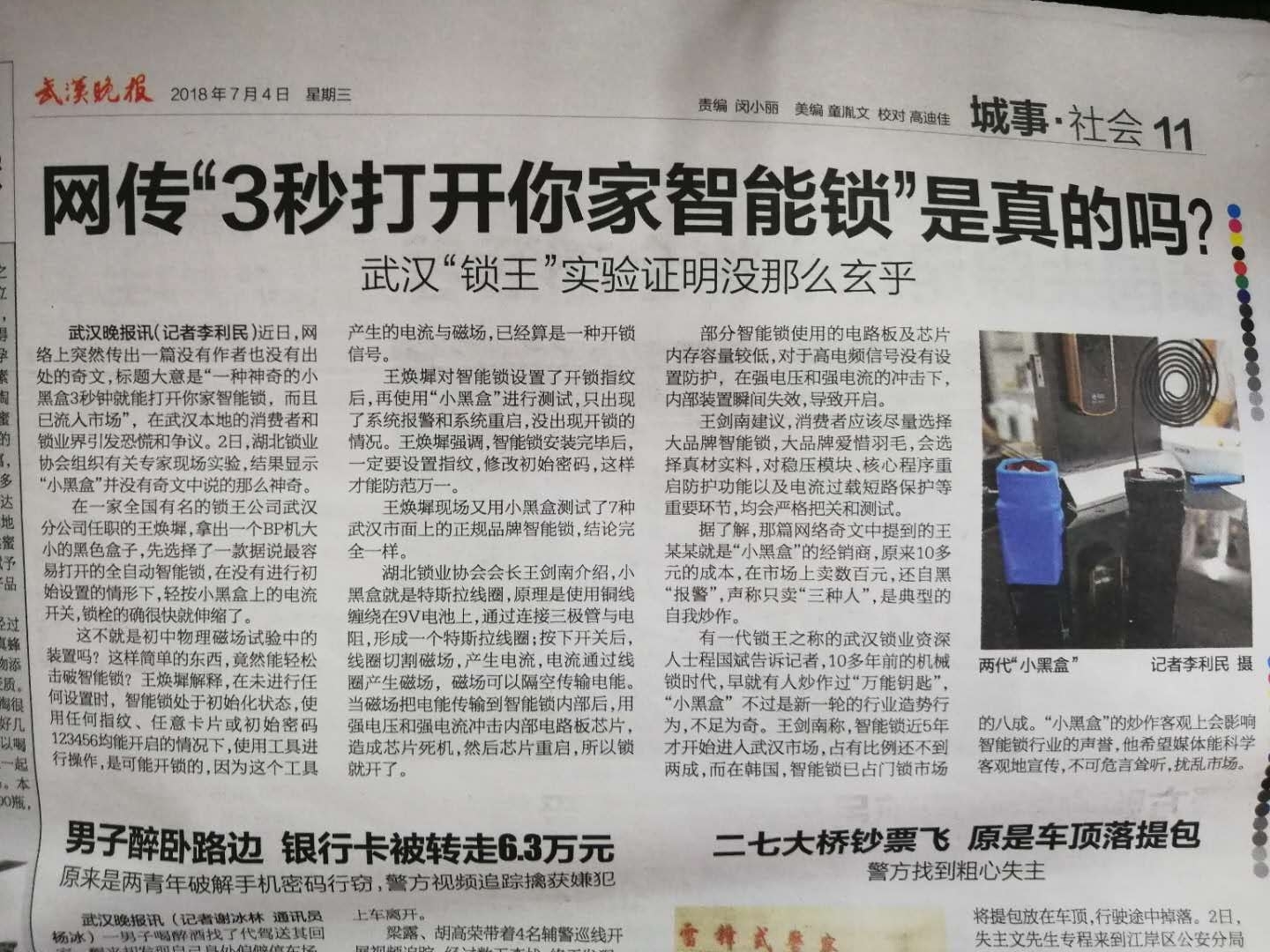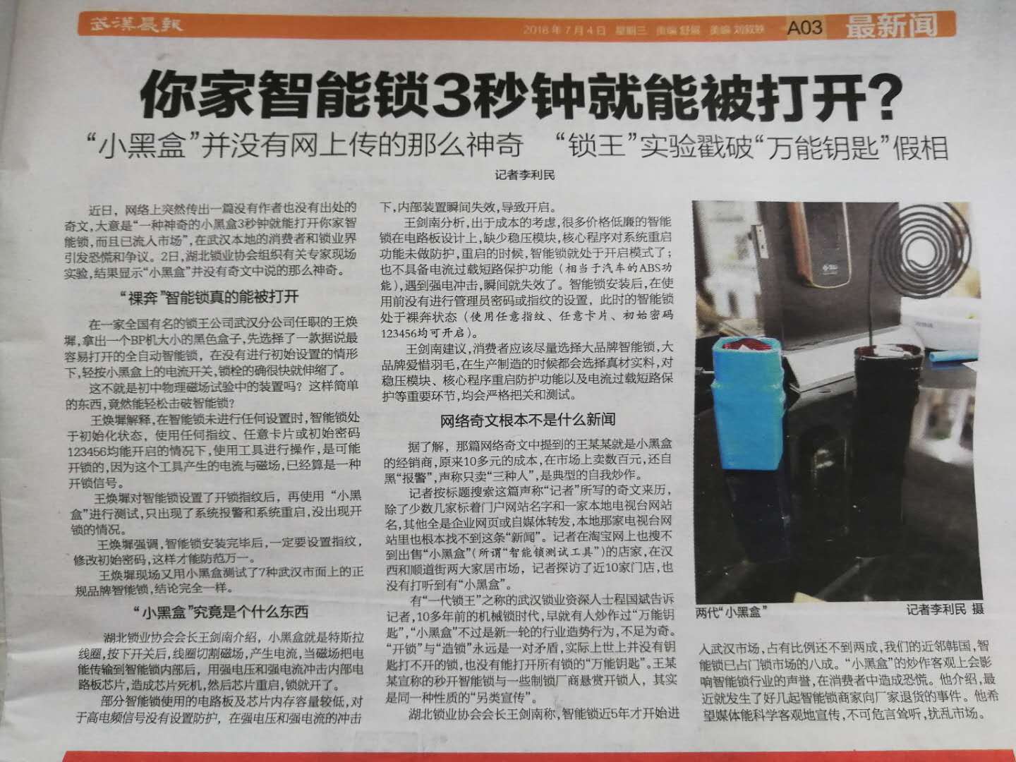 7月2日,湖北锁业协会组织联合长江日报现场实验,结果显示“小黑盒”并没有奇文中说的那么神奇。