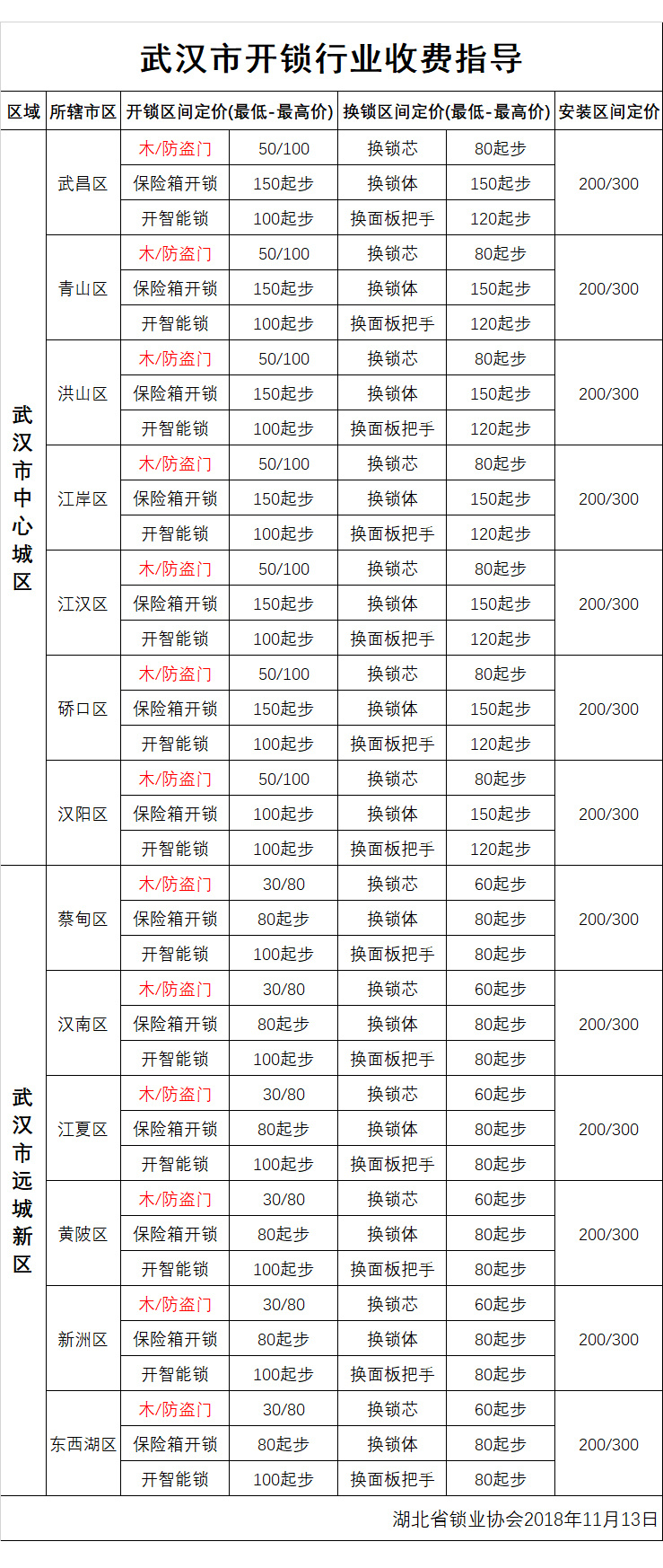 武汉市开锁行业收费指导公示