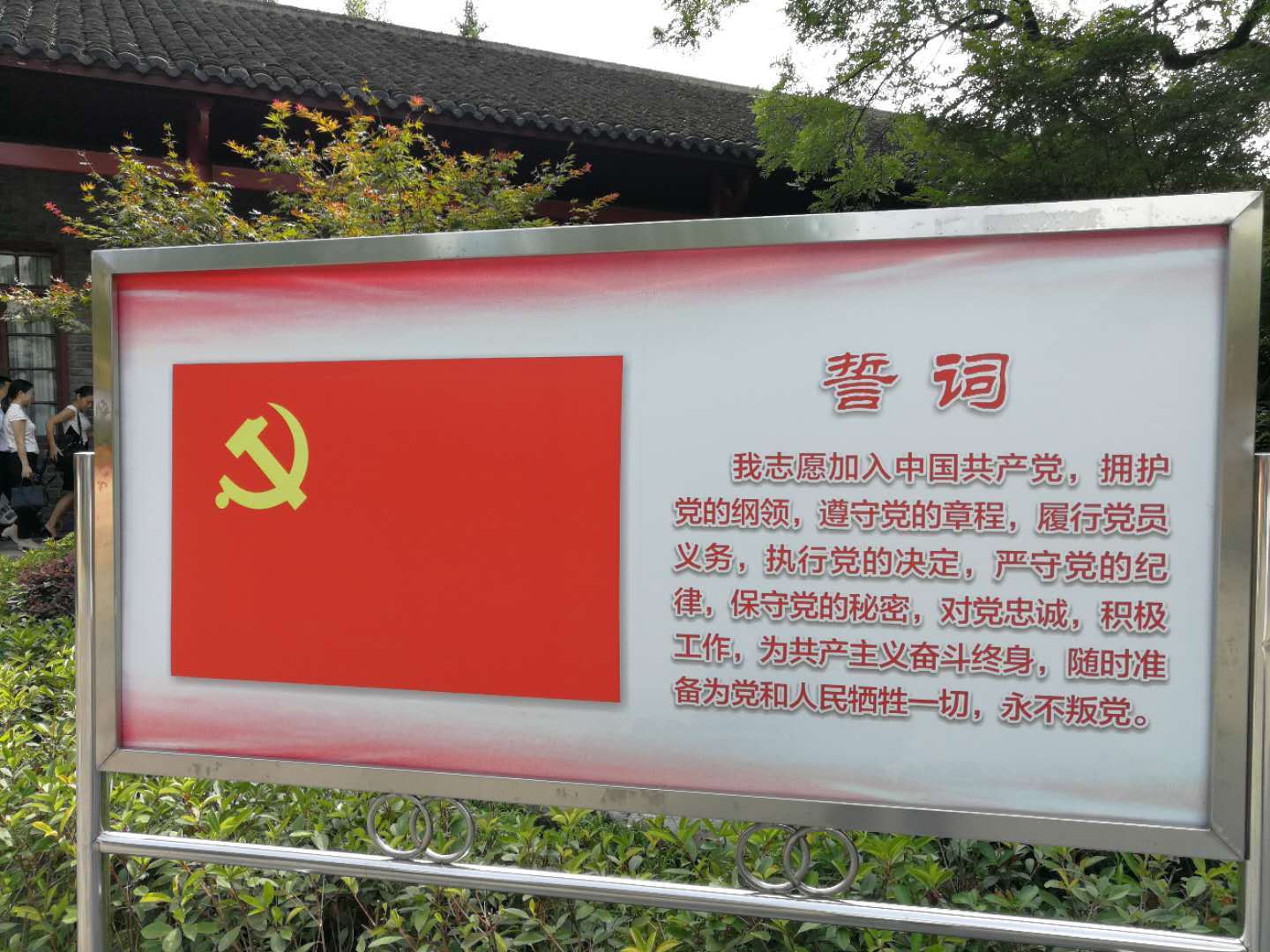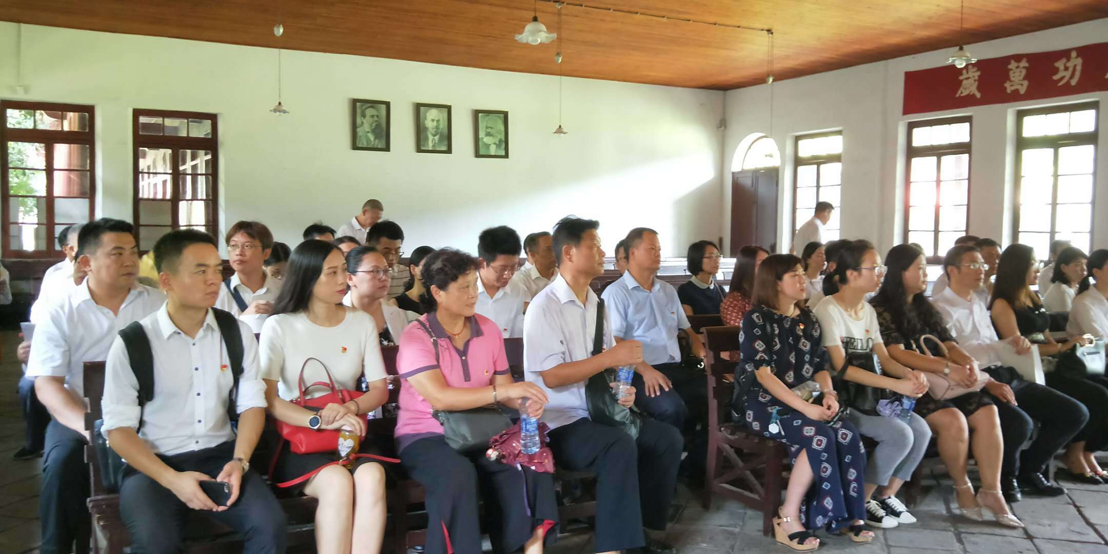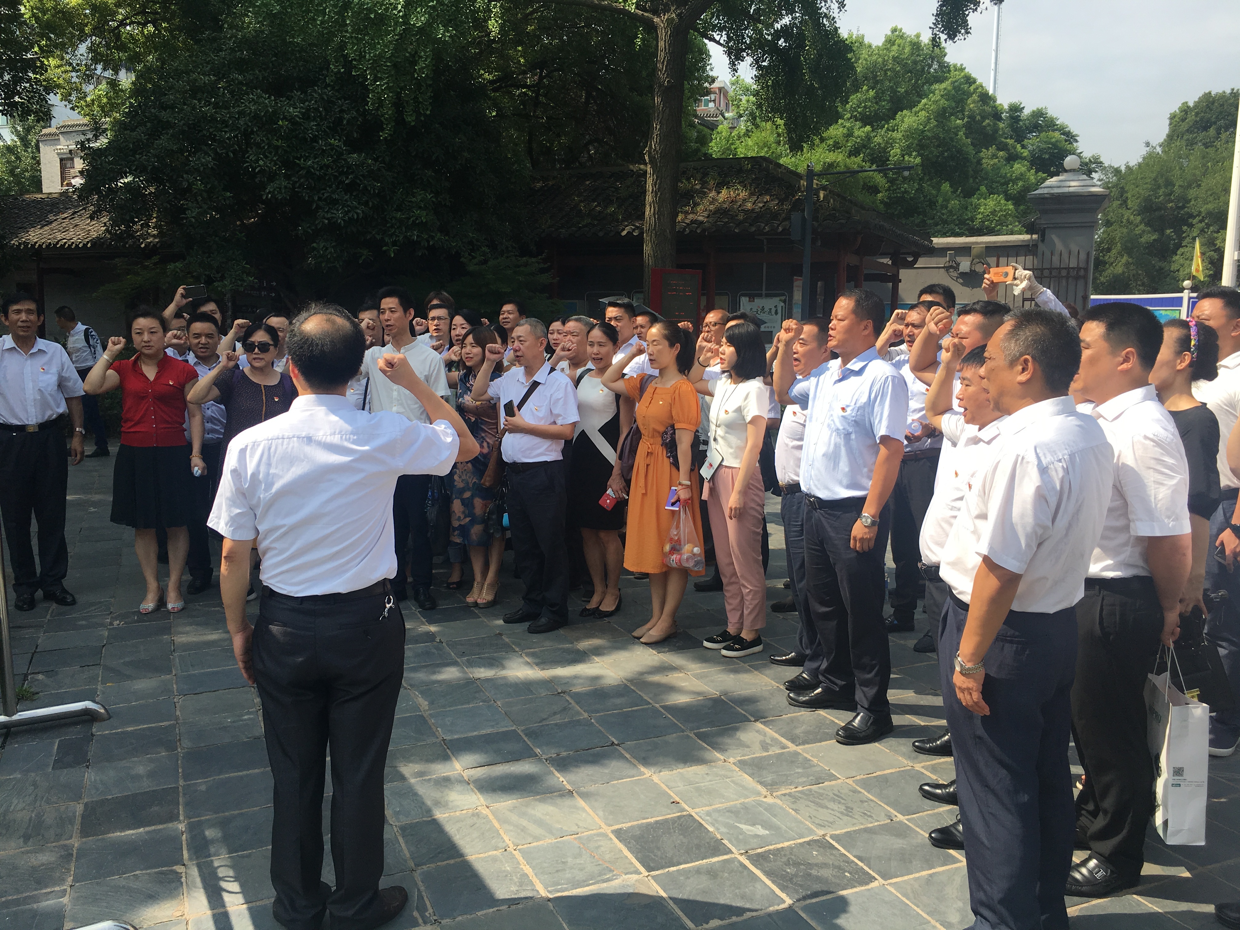 上午10点,武昌中央农民运动讲习所旧址内,全体党员佩戴党徽,面对党旗,高举右手,在总会会长吴斌详同志带领下重温入党誓词。